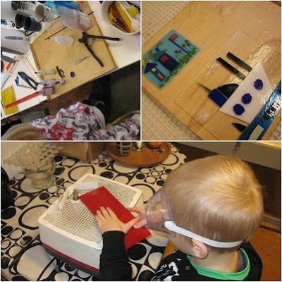 På de sidste par glaskurser har dyrene haft en stor rolle, og kursisterne har både leget og fordybet sig. Her er et par forskellige teknikker repræsenteret. Fiskene (motiv fra en copyright fri bog) er tegnet over på det transparente glas med en pen med glasfarve, har fået lidt farveklatter med bittesmå glasstykker, og så er der leget med placering / beskæring. Her kan I se mellemstadiet, hvor det fusede - faktisk blev det tack-fuset - ligger på formen, klar til at blive slumpet.